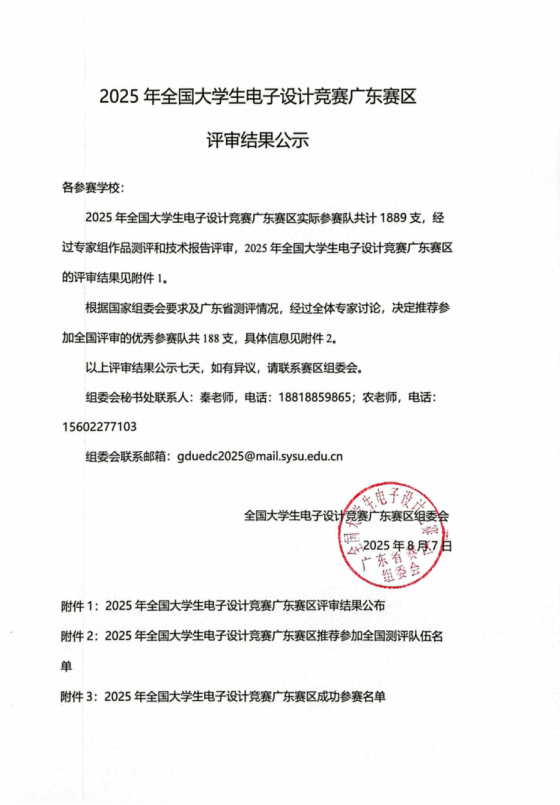 近日,在由教育部倡导,教育部高等教育司、工业和信息化部人事教育司共同主办的2025年“TI杯”全国大学生电子设计竞赛中,我院黄家晖老师指导的团队斩获E题省级三等奖的佳绩。