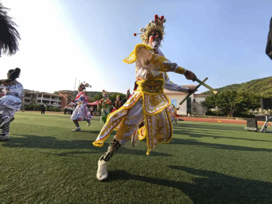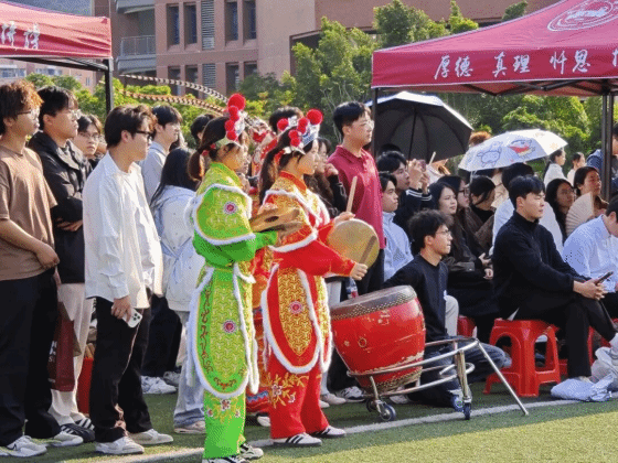 电气学院的少年们身着英歌袍,油彩勾勒的傩戏脸谱随笑容闪闪发亮。槌木在他们手中化作带电的笔锋——劈、挑、旋、点,每个动作都裹着猎猎风声,把百年古舞敲击出金属质感的回响。