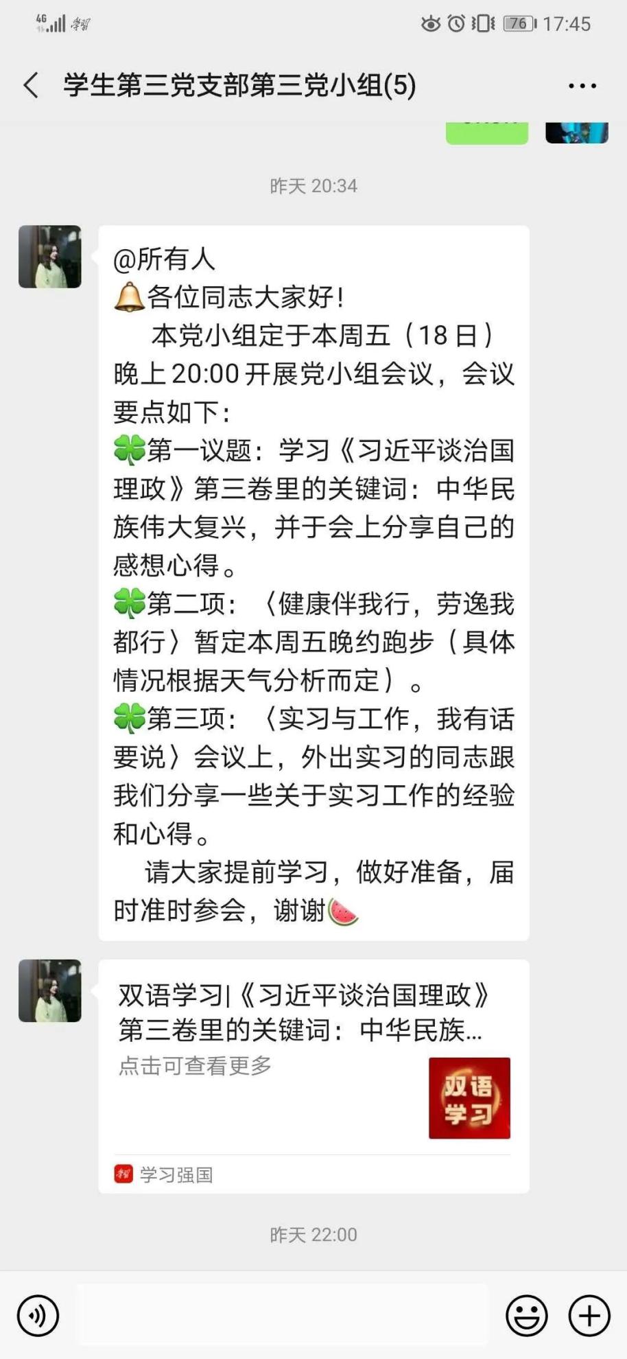 9月18日,学生第三党支部第三党小组全体成员集体学习《习近平谈治国理政》第三卷关键词:中华民族伟大复兴。这本书是全面系统反映习近平新时代中国特色社会主义思想的权威著作,对于推动广大党员、干部和群众学懂弄通做实习近平新时代中国特色社会主义思想具有重要意义。