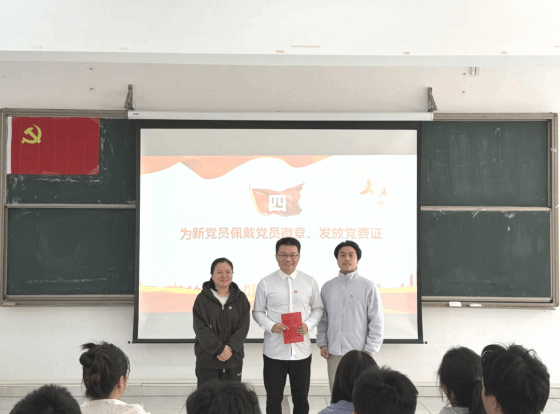 接着,支部书记和委员为新党员佩戴党徽和发放党员证。新党员们依次上台,佩戴上熠熠生辉的党徽,接过承载着责任与使命的党员证。