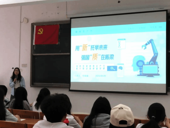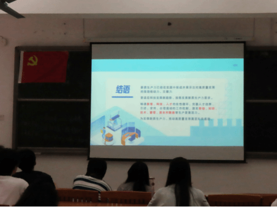 然后,毛老师引导同学们思考:作为通信、软件工程等专业的学子,如何将所学融入新质生产力发展?她鼓励大家积极参加挑战杯、学科竞赛,利用AI算法优化制造业质检、预测设备故障,以专业技能赋能传统产业转型升级。