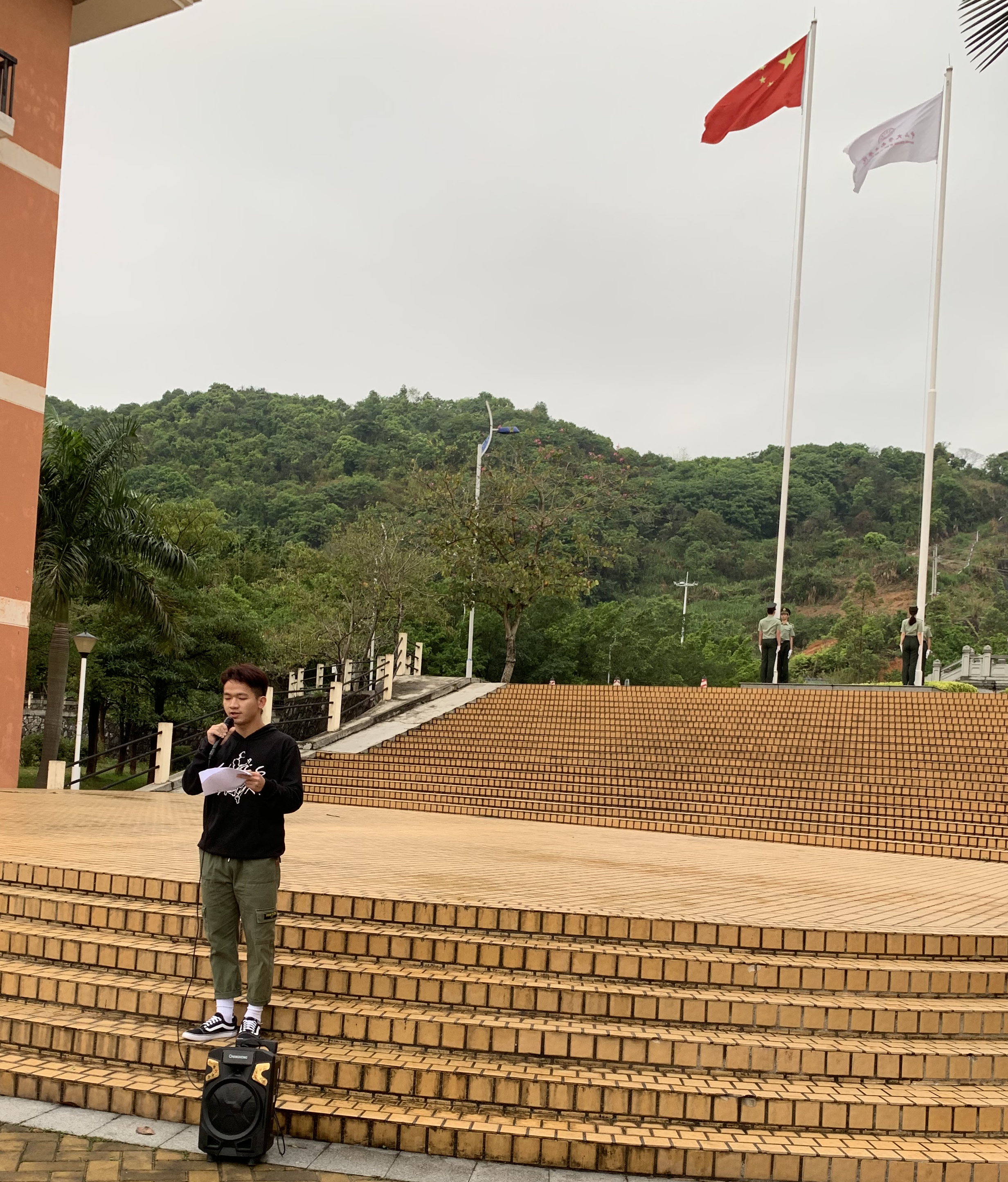 升旗礼毕后,接着开展国旗下的讲话。徐洛钦--即将毕业的大四学长,在今年国考中以笔试第一、面试第一的好成绩考上了公务员。他用他的经验为大家的学习、工作、生活提出建议,勉励同学们共同进步。