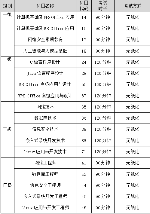 根据教育部考试中心的考试安排与我学院考点的实际情况,2026年上半年全国计算机等级报考时间2025年12月26日10:00时至2026年1月5日16:00时。我校考点可接受报名的科目及说明如下表: