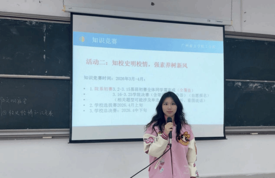新学期伊始,为深入贯彻“三全育人”工作要求,精准回应2023级学生成长发展的阶段性要求,工学院2023级辅导员毛依丽、邓莉、杨有丽、钟冰倩面向本科班级开展2026年春季学期第一次主题班会。本次班会围绕成绩分析、班级学风建设、校园安全、宿舍环境整治及“知校史·明校情·强素养·树新风”知识竞赛等内容展开。主题班会打造有温度、有深度、有专业辨识度的成长学堂,为学子们的大学生活筑牢基础、明确方向。