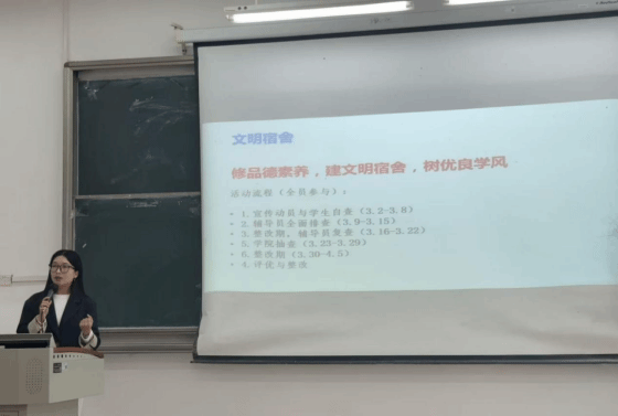宿舍作为同学们在校期间学习、生活、交流的重要场所,良好的宿舍环境不仅关乎个人身心健康,更能培育文明素养、凝聚班级合力。为此,辅导员就宿舍环境整治工作提出明确要求,强调要以“干净、整洁、有序、文明”为标准,全面开展宿舍环境清理工作,及时清理宿舍内堆积的杂物、垃圾,规范摆放个人物品、学习用具和生活用品,做到桌面整洁、地面干净、阳台有序;杜绝在宿舍内私拉电线、违规使用大功率电器等行为,坚守消防安全底线,同时倡导同学们相互配合、分工协作,养成良好的卫生习惯,定期开展宿舍大扫除,营造整洁舒适、互帮互助的宿舍氛围,共同打造文明宿舍、和谐家园。