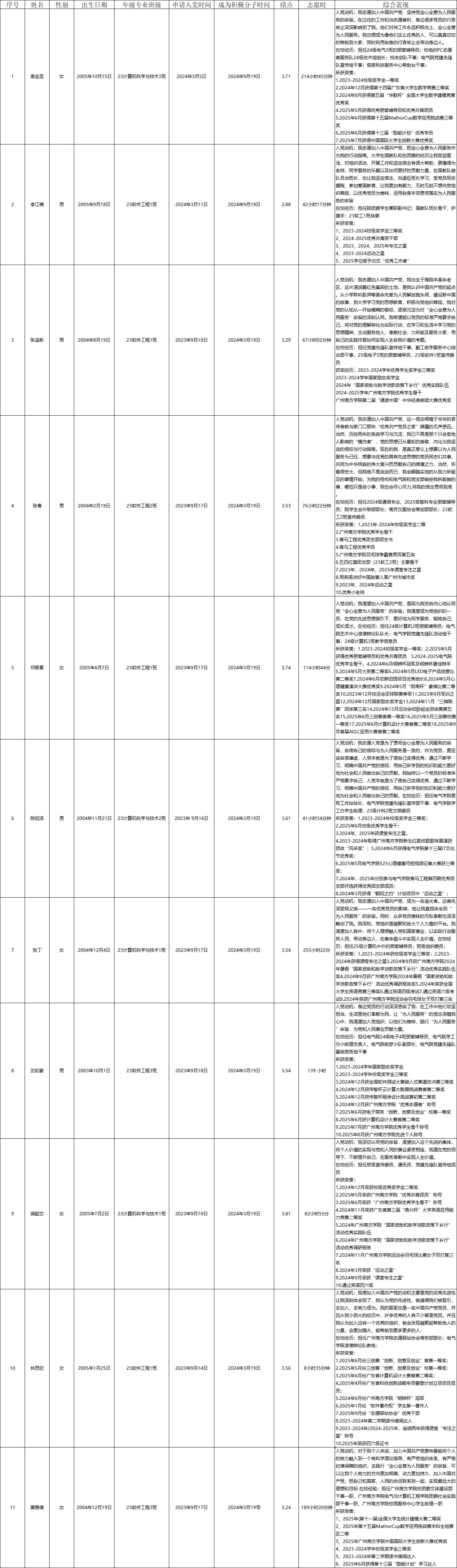 根据《中国共产党发展党员工作细则》的有关规定,在听取党小组、培养联系人、党员和群众意见的基础上,经学生第二党支部委员会讨论,拟从经过一年以上培养教育和考察基本具备党员条件的入党积极分子中推荐以下11名同学参加2025秋发展对象培训班,现予以公示。
